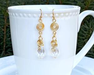 Crystal Briolette Drop Gold Wire Earrings, 2.2 Inches Long